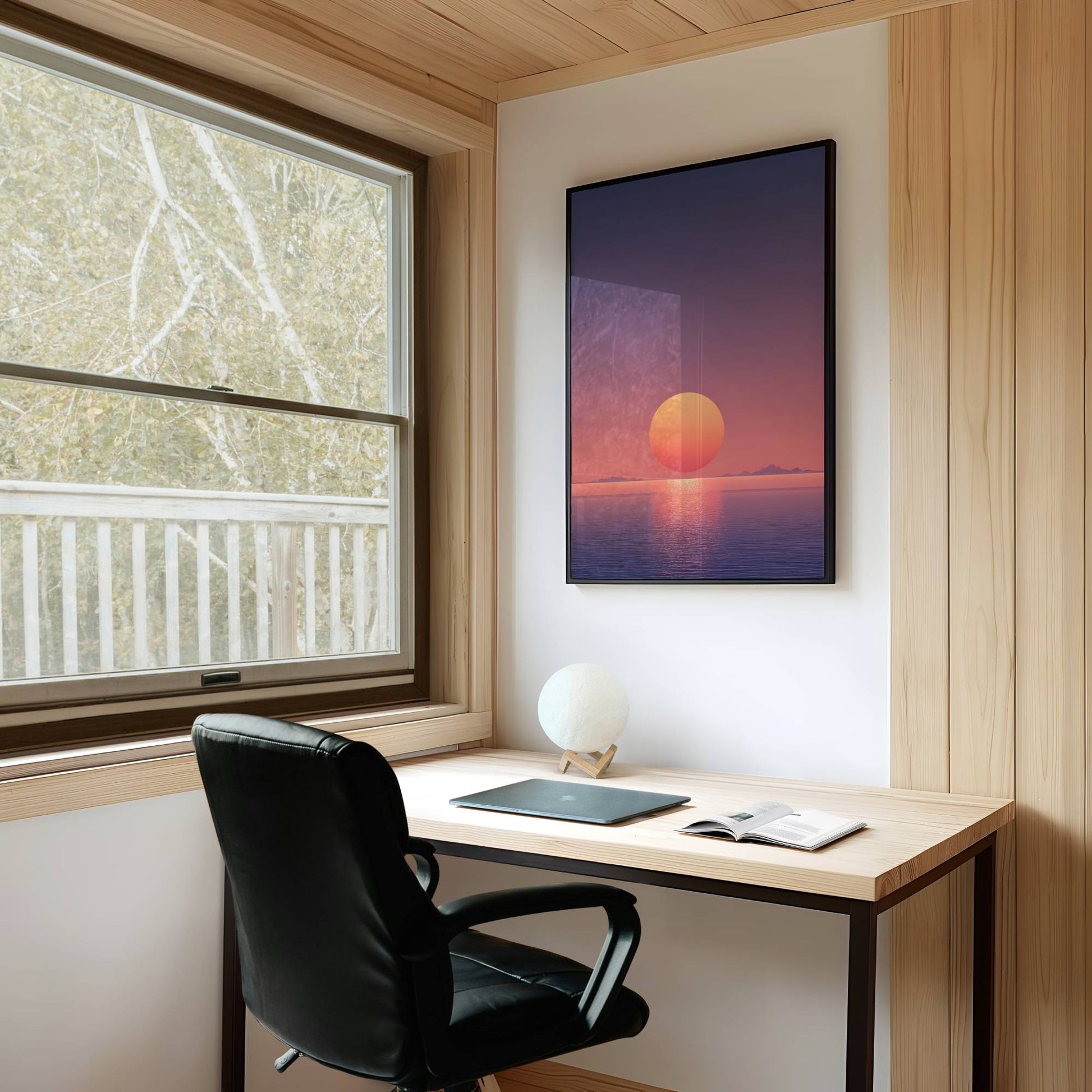 Experience the serene beauty of a futuristic sunset reflected over tranquil waters with this modern home decor piece. Its sleek design and vibrant hues bring a sophisticated touch to any living space, blending contemporary style with calming natural elements. Perfect for adding a subtle yet striking accent to your home, this artwork invites a peaceful ambiance while showcasing a visionary aesthetic.